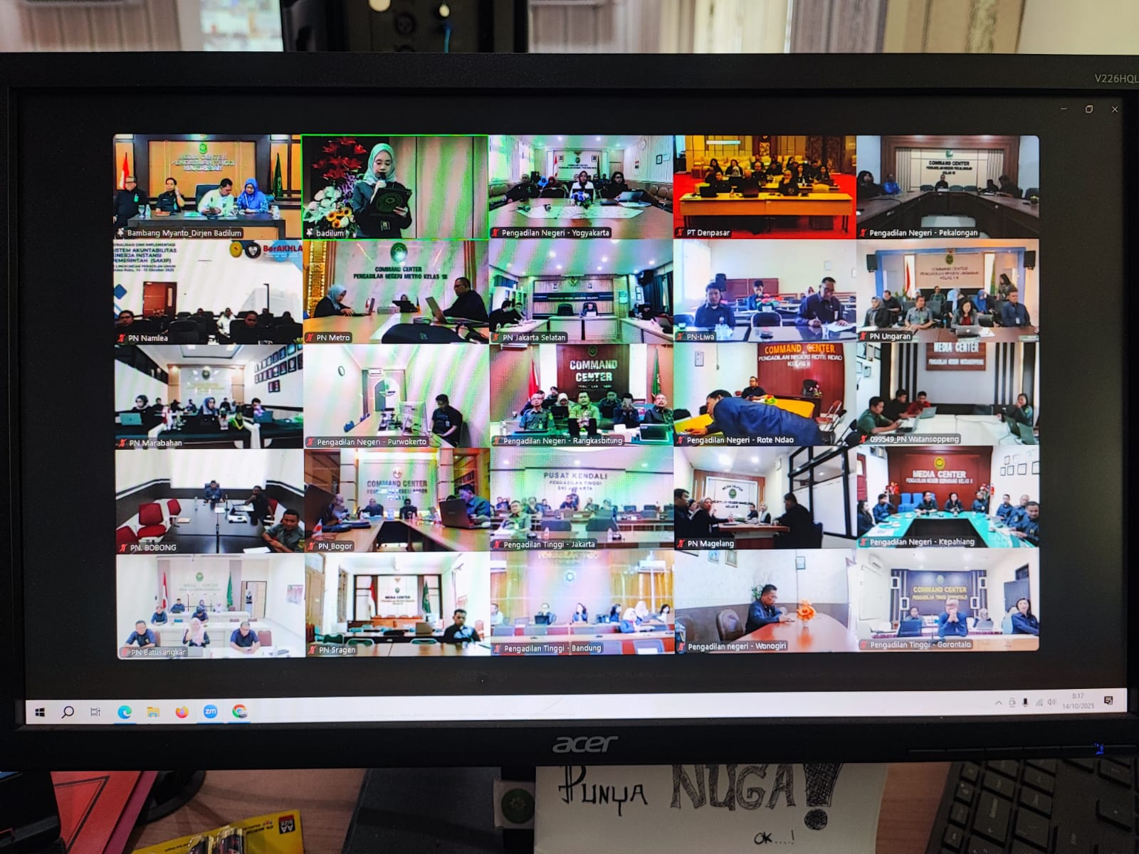 Rabu, 15 Oktober 2025, bertempat di ruang Command Center, Ketua Pengadilan Negeri Yogyakarta, Tuty. Budhi Utami, S.H., M.H. bersama Panitera, Sekretaris, Panitera Muda dan Kepala Sub Bagian mengikuti Kegiatan Sosialisasi dan Implementasi Sistem Akuntabilitas Kinerja Instansi Pemerintah (SAKIP) di Lingkungan Badilum secara daring. Pelaksanaan acara kegiatan dibuka secara langsung oleh Direktorat Jenderal Badan Peradilan Umum, H. Bambang Myanto, S.H., M.H.. Kegiatan yang diselenggarakan secara dua hari pada tanggal 14-15 Oktober 2025 dalam rangka penerapan Reformasi Birokrasi Mahkamah Agung RI pada area akuntabilitas dan mewujudkan Manajemen Perencanaan Kinerja di lingkungan Mahkamah Agung RI sesuai peraturan Presiden nomor 29 tahun 2014 tentang Sistem Akuntabilitas Kinerja Instansi Pemerintah dan Permenpan RB nomor 53 tahun 2014 Tentang Petunjuk Teknis Perjanjian Kinerja, Pelaporan Kinerja dan Tatacara Reviu atas Laporan Kinerja Instansi Pemerintah.