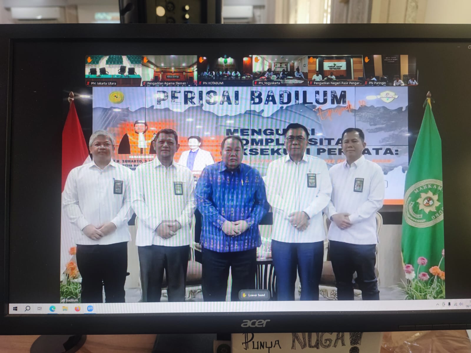 Pelaksanaan pertemuan rutin dan sarasehan interaktif (Perisai Badilum) diharapkan mampu meningkatkan budaya berdiskusi sesuai dengan tema diskusi seputar pernasalahan yang dihadapi oleh para tenaga teknis di lapangan sekaligus mempererat hubungan antar aparatur peradilan. Dalam pelaksanaan sarasehan interaktif menghadirkan narasumber YM Wakil Ketua Mahkamah Agung RI Bidang Yudisial, H. Suharto, S.H., M.Hum. yang menyampaikan paparan materi terkait “Permasalahan Eksekusi Perdata, dan Prospek Pembaharuan Hukum dalam Eksekusi Perdata”. Setelah penyampaian materi kegiatan dilanjutkan dengan diskusi/dialog interaktif antara narasumber, moderator dan peserta yang hadir/mengikuti secara online.