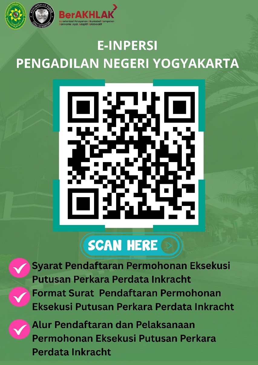 Saat ini Pengadilan Negeri Yogyakarta telah membuat inovasi baru, yang bernama ‘E-InPerSi”, yakni Elektronik Informasi Pendaftaran Eksekusi yang dapat mempermudah anda untuk memahami syarat, surat permohonan pendaftaran eksekusi, serta alur pendaftaran dan pelaksanaan eksekusi putusan perkara perdata inkracht yang dapat diakses melalui QR Code berikut ini: